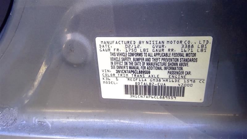 2012 NISSAN VERSA 12 1.6L (VIN C 4th Digit HR16DE) Engine Assembly